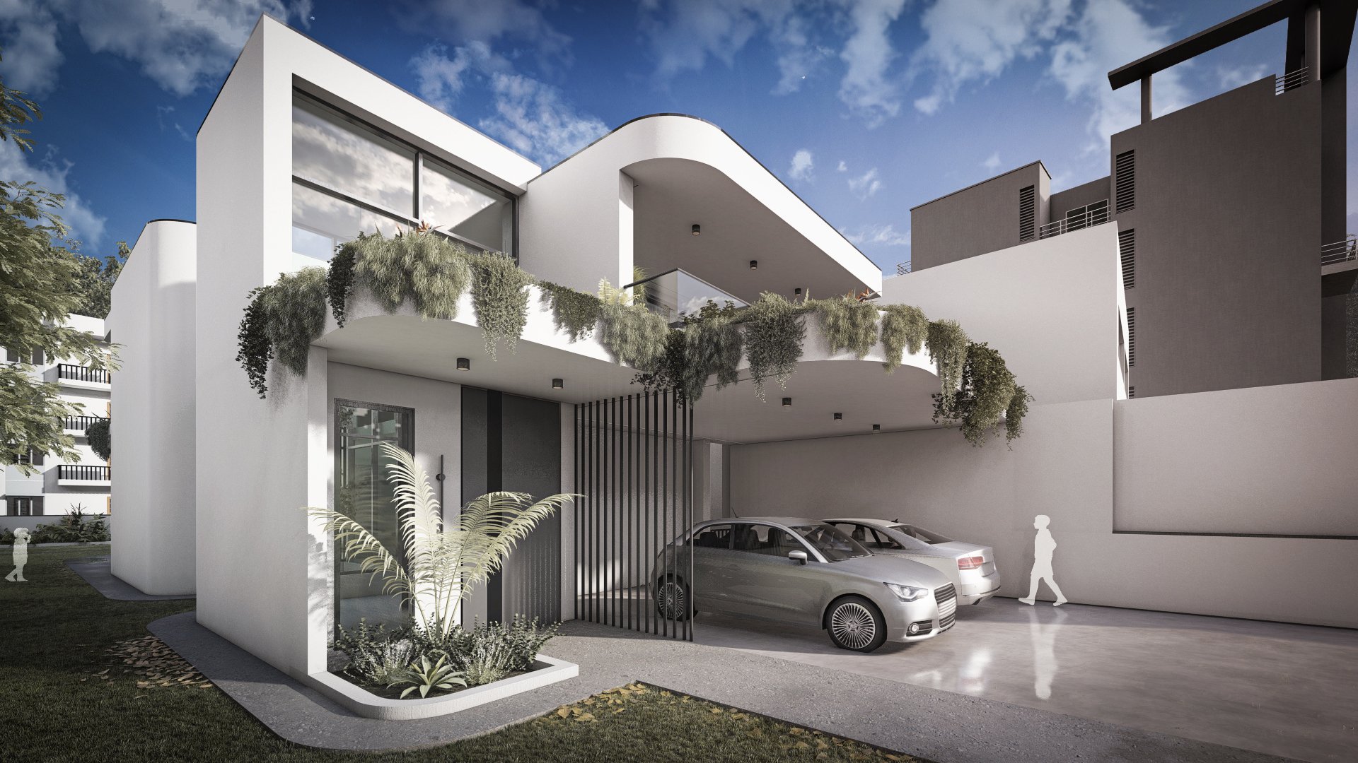 Με αυτό το σκεπτικό, δημιουργήσαμε έναν χώρο όπου οι καθαρές γεωμετρίες συναντούν τις ήπιες καμπύλες, διατηρώντας το κτίριο γειωμένο αλλά ταυτόχρονα ανοιχτό. Το φως και η αίσθηση του χώρου επιτυγχάνονται μέσα από τις διαστρωματωμένες όψεις, ενώ τα γλυπτικά στέγαστρα και οι στρογγυλεμένες βεράντες αποτελούν βασικά χαρακτηριστικά του σχεδιασμού. Τα στοιχεία αυτά προσδίδουν κίνηση και ενέργεια στο κτίριο, μετατρέποντάς το σε ένα πλαίσιο μέσα στο οποίο το φως και η φύση αποκτούν ενεργό ρόλο.