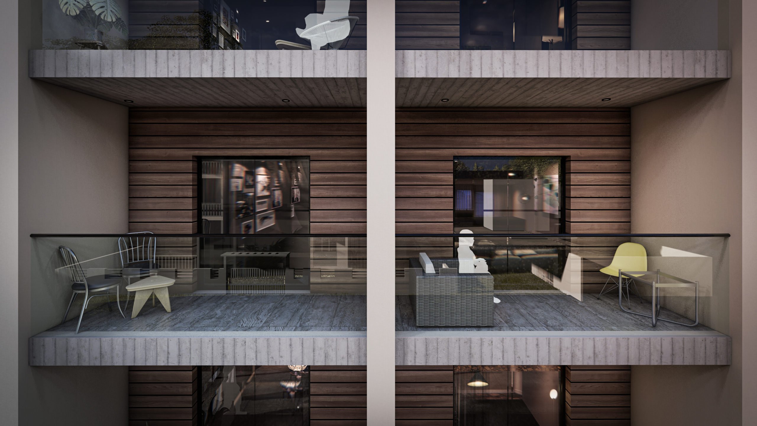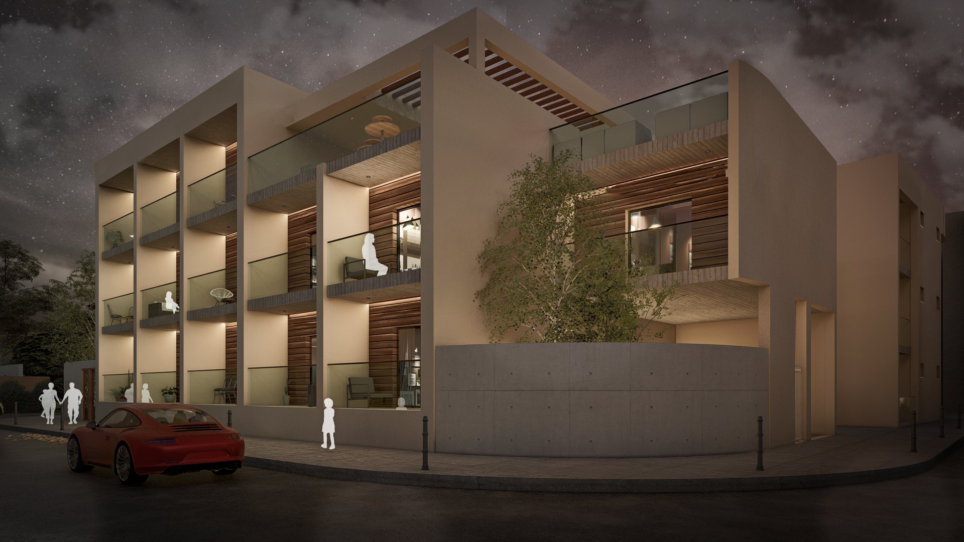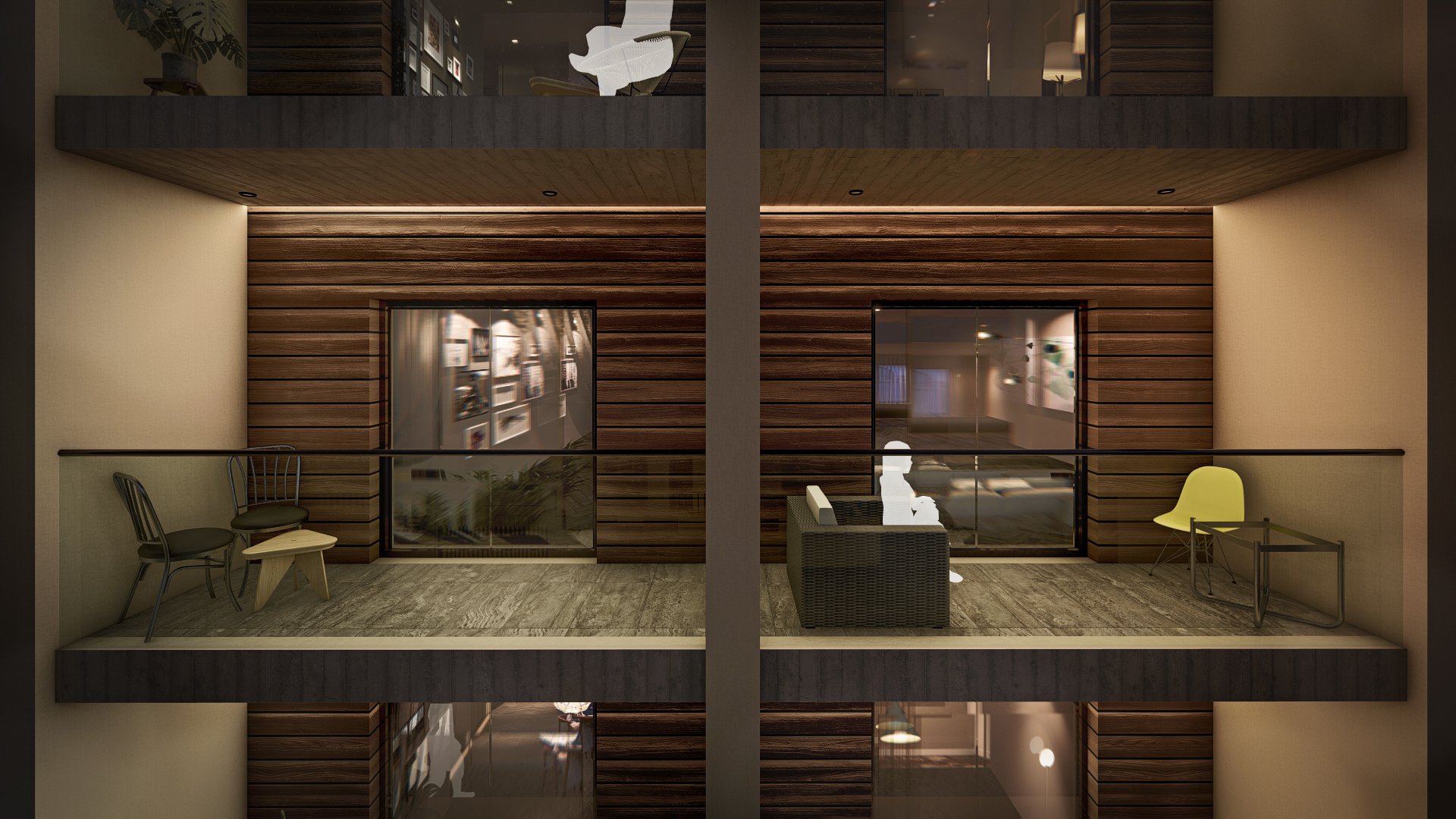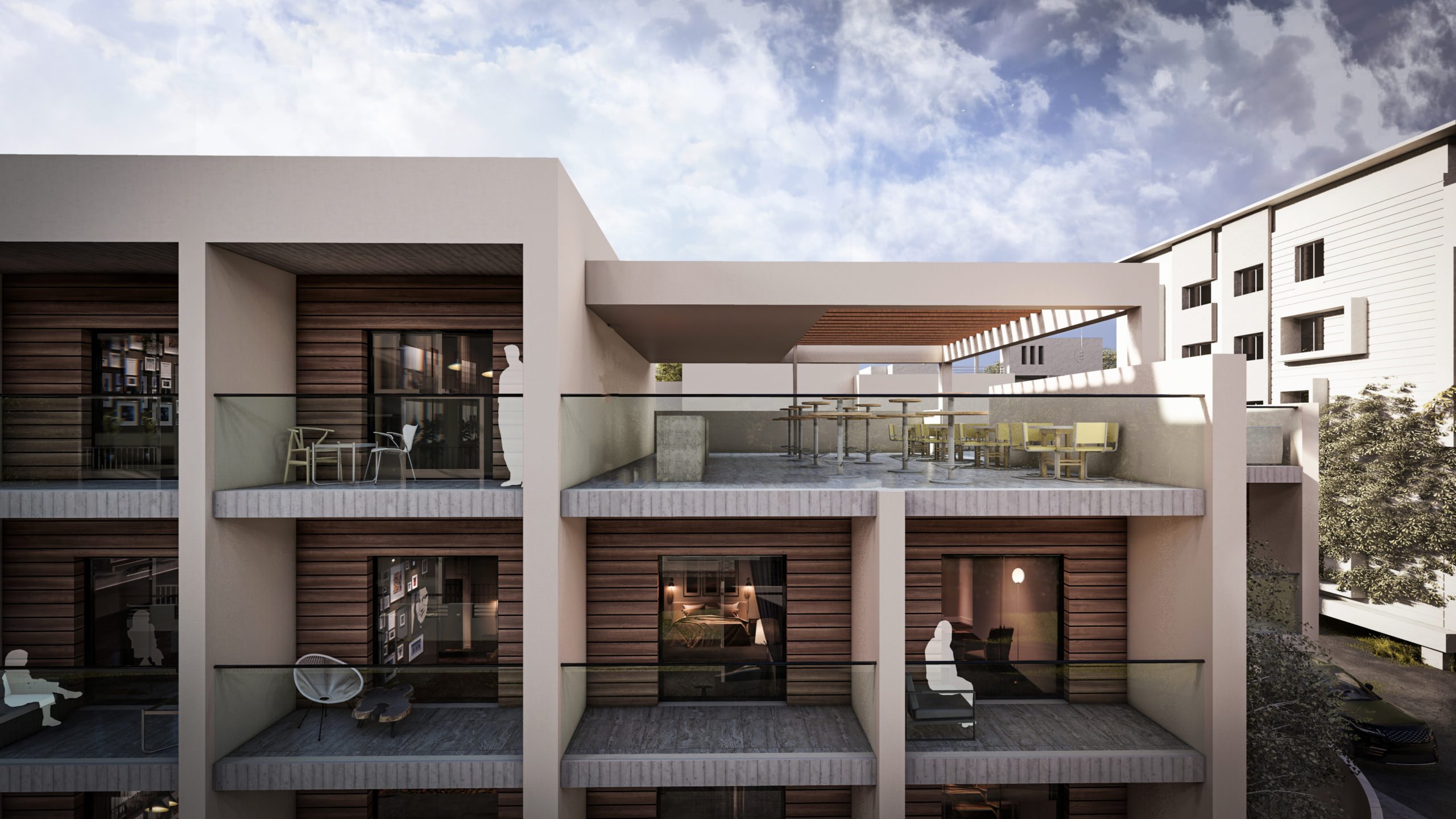 In terms of materials, the exterior remains soft and neutral, with light-colored plaster as the dominant element. The horizontal wood cladding on the balconies adds warmth and texture without creating stark contrasts. Some surfaces remain exposed and unfinished, leaving room for future artistic interventions.