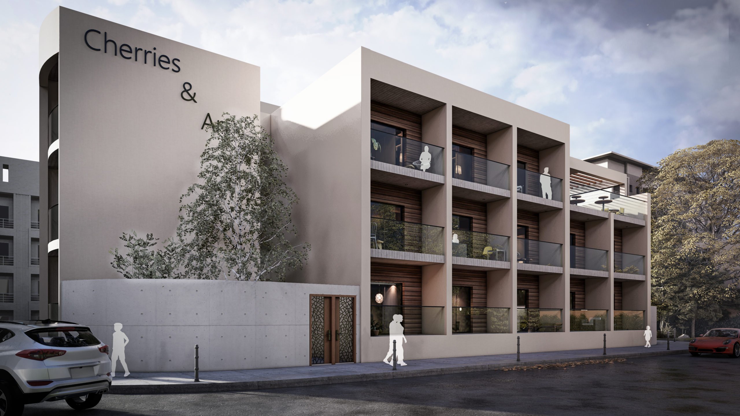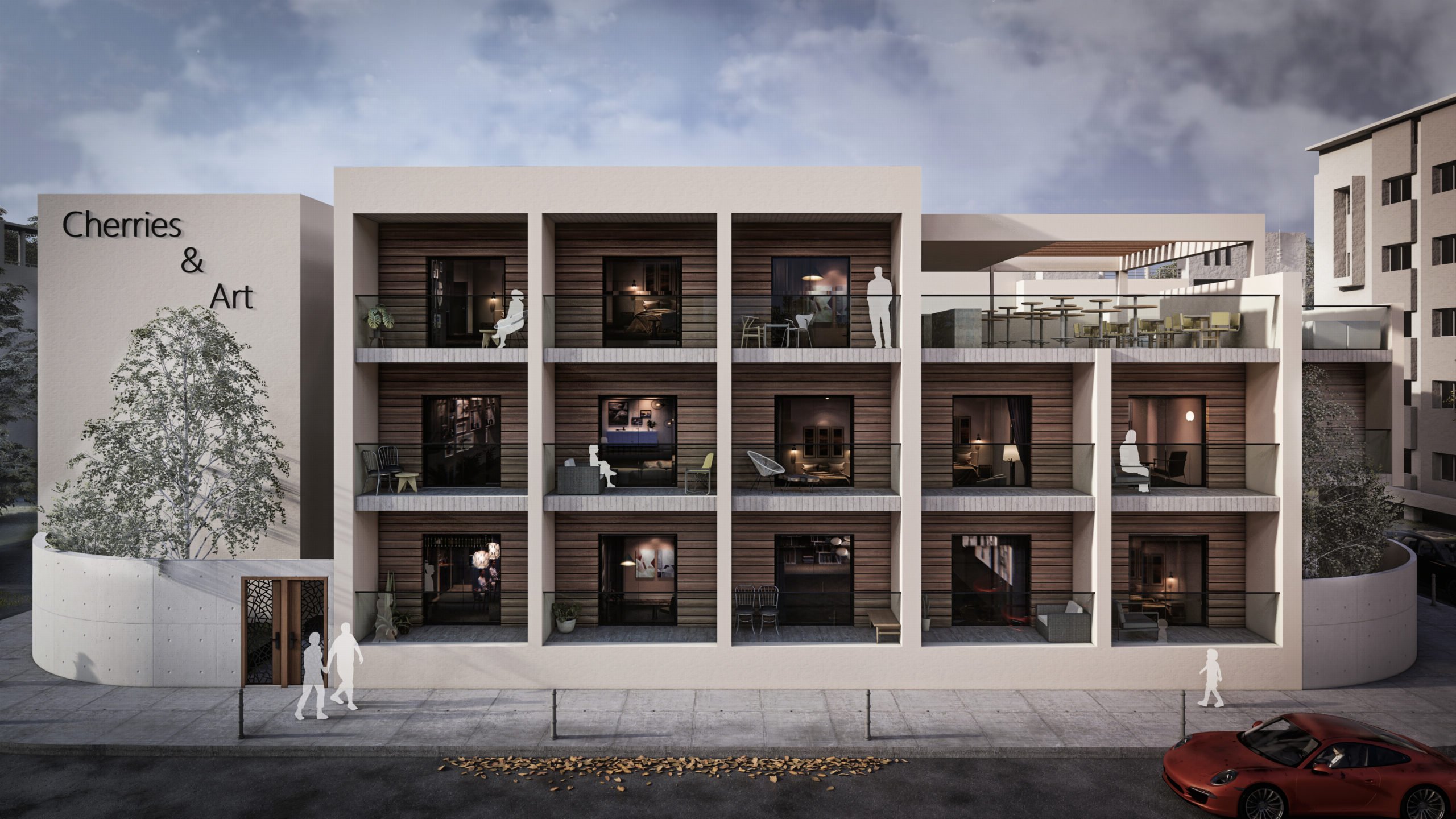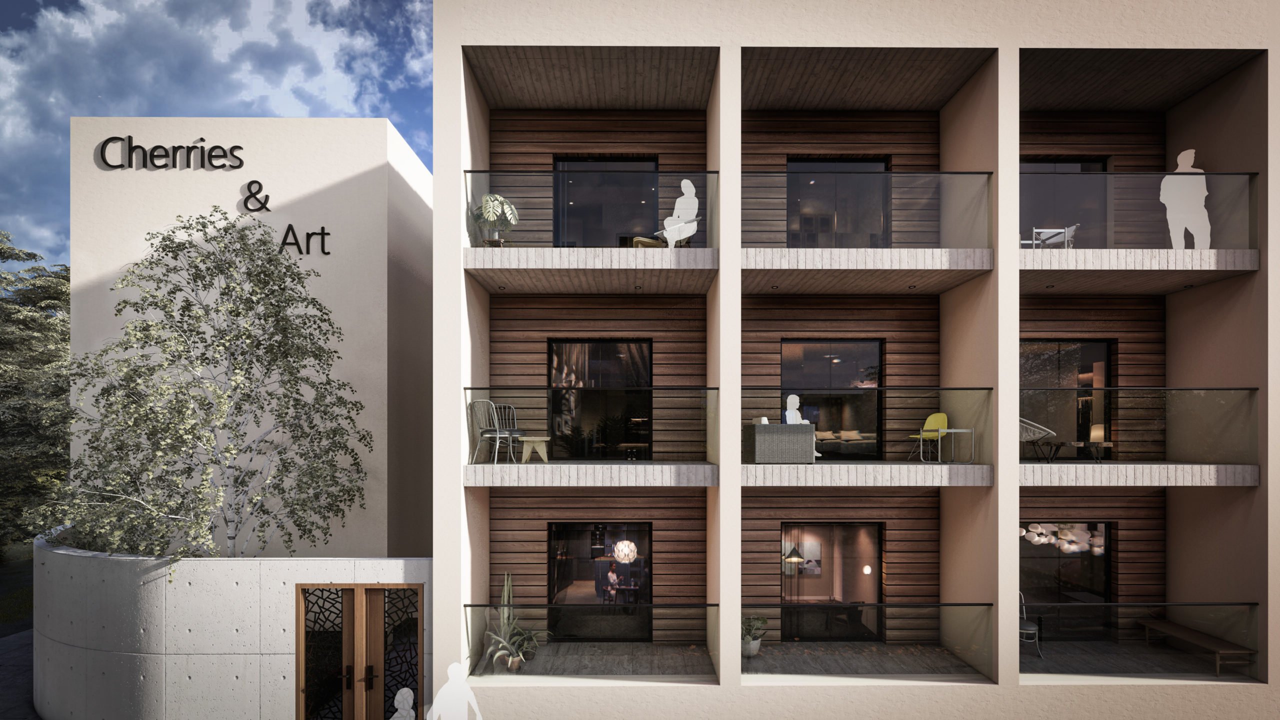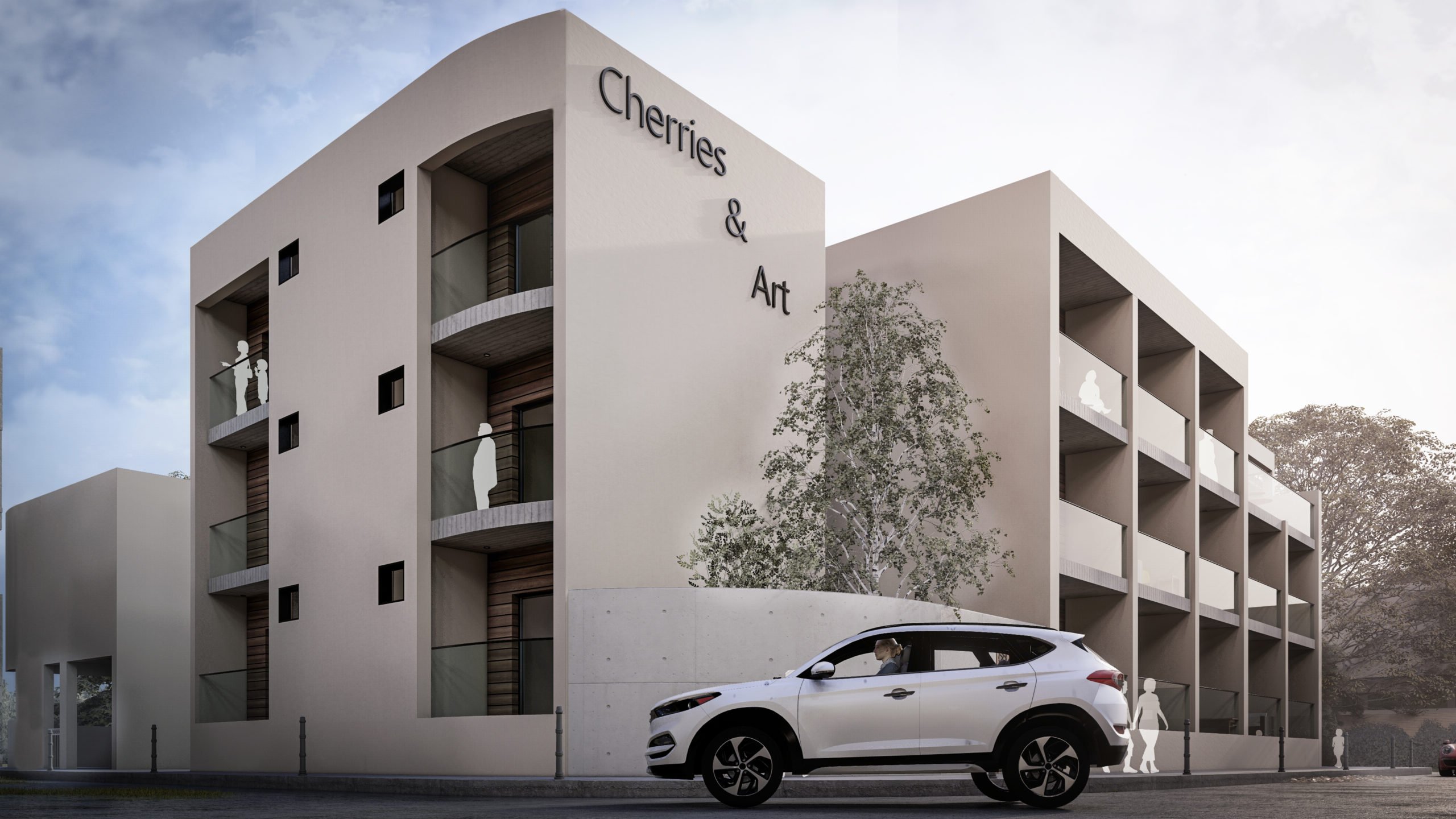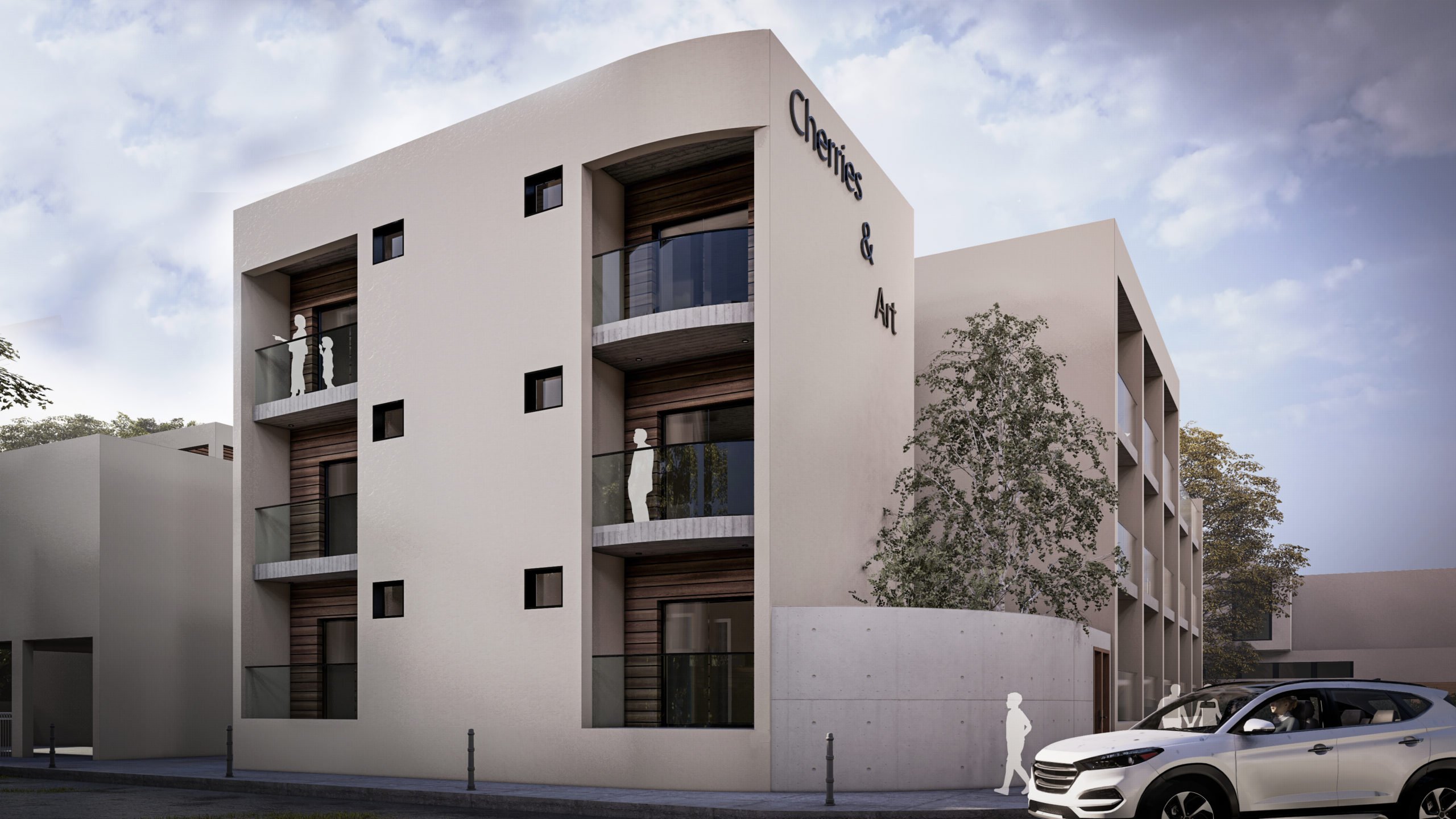 Cherries & Art is a modern student residence complex with clean geometry and a calm architectural presence. Despite its name, the building does not follow temporary trends but adopts a timeless look that avoids visual overload. Its location in the historic center of Limassol was a key reference point for its design, so that it would blend smoothly into the urban environment and meet the needs of modern student life.The building's form consists of distinct volumes, while maintaining a simple and clear composition. The vertical sections form recessed balconies and create depth and shade on the façade, while allowing natural light to reach the apartments and providing space for outdoor use.