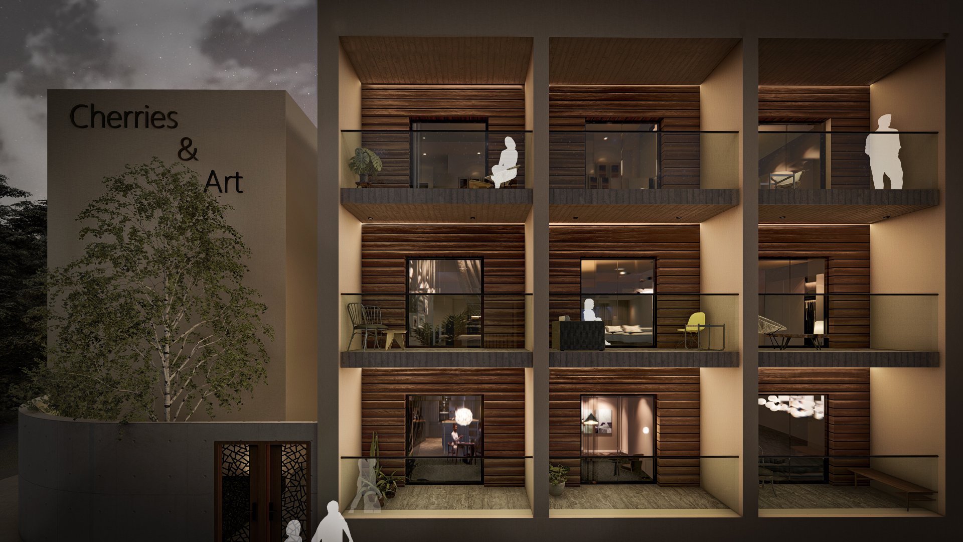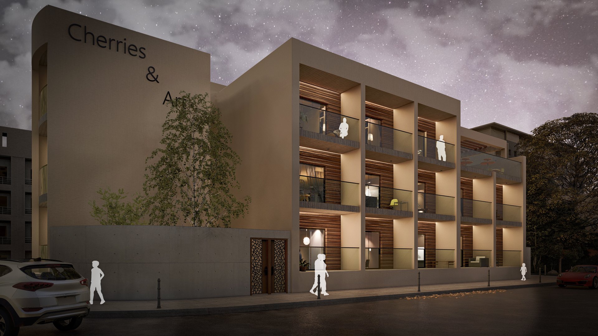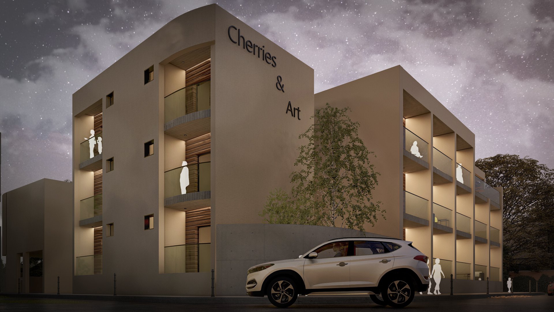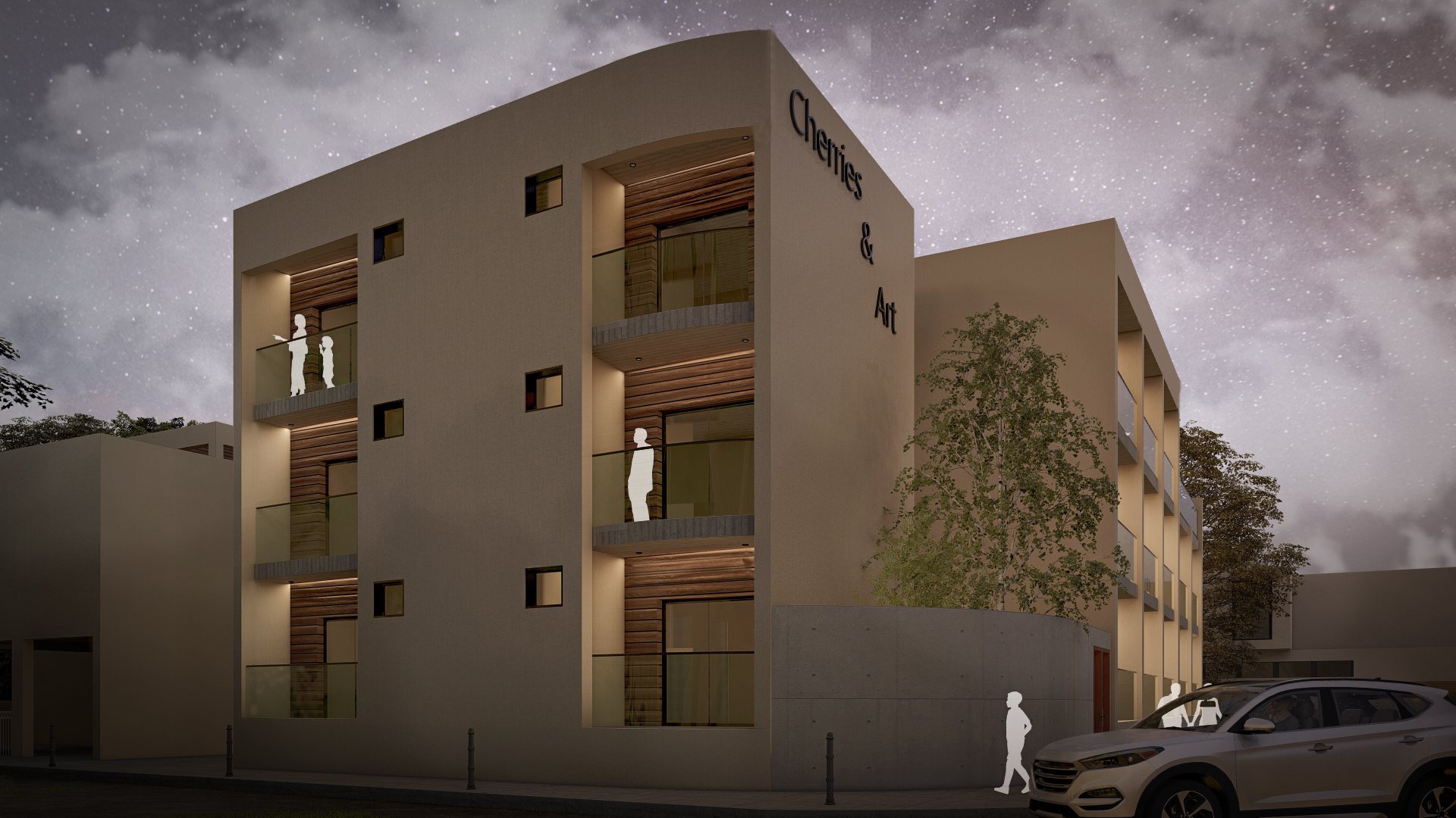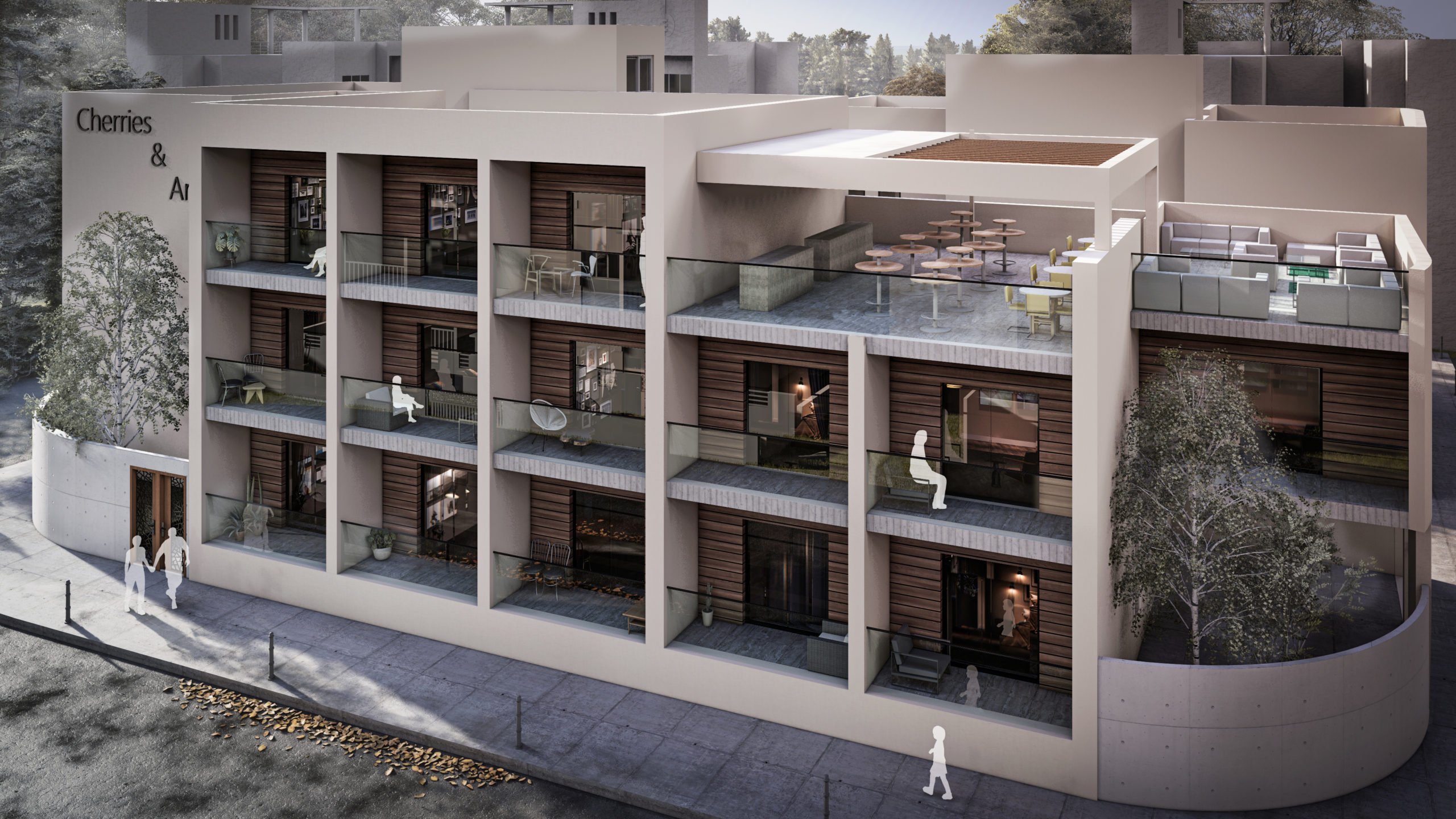 Cherries & Art is a modern student residence complex with clean geometry and a calm architectural presence. Despite its name, the building does not follow temporary trends but adopts a timeless look that avoids visual overload. Its location in the historic center of Limassol was a key reference point for its design, so that it would blend smoothly into the urban environment and meet the needs of modern student life.The building's form consists of distinct volumes, while maintaining a simple and clear composition. The vertical sections form recessed balconies and create depth and shade on the façade, while allowing natural light to reach the apartments and providing space for outdoor use.